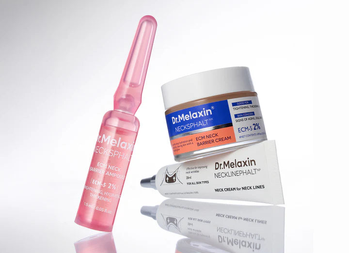 Necksphalt ECM Neck Barrier Ampoule is designed to improve neck wrinkles and enhance skin elasticity. It features the patented ingredient ECM-5, which has been clinically proven to be effective in reducing neck wrinkles.